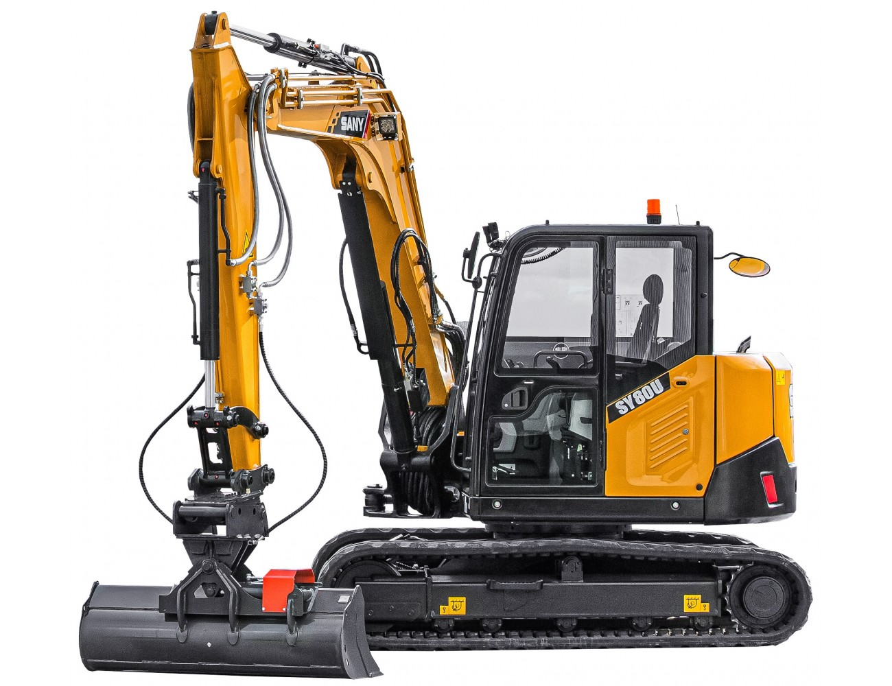 Zvýšená produktivita vďaka bezpečnosti - f rom ROPS- a FOPS certifikované kabíny vodiča k široké zorné pole pre prevádzkovateľa štandardných bezpečnostných ventilov a uzamykateľnú ochranného krytu - za SY80U nebude rezať zákruty, pokiaľ ide o bezpečnosť. Až do najmenších detailov - dokonca aj bezpečnostné ventily a kryty valcov sú rovnako ako LED pracovné svetlá štandardne dodávané zo závodu. To platí aj pre údržbu a servis - rotujúce alebo horúce komponenty motora sú chránené proti náhodnému dotyku.